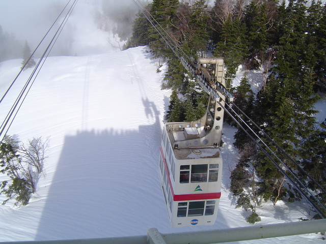 <這是第一段纜車-第一段由標高1117公尺的新穗高纜車口約5分鐘可抵達標高1305公尺的鍋平高原>