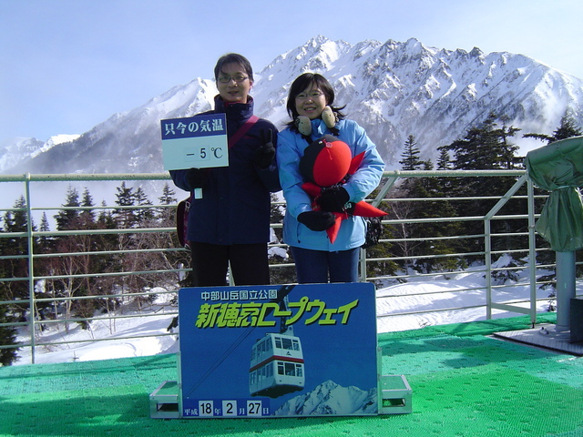 當纜車一路升高 還穿過雲霧呢 ㄧ下纜車就是到展望台上 氣溫只有零下5度C 到了展望台 雲霧散去 突然看到高山大家都驚呼ㄧ聲 全日本唯一的雙層高山纜車從新穗高到終點展望台,長達3200公尺(世界第2長),由空中360度欣賞北阿爾卑斯山美景